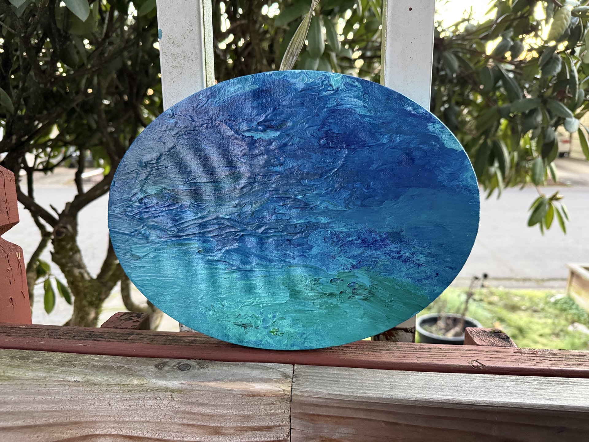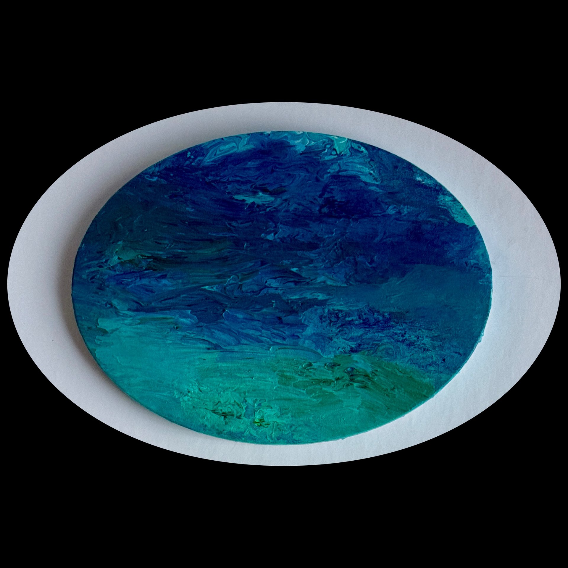 “Beneath the Turquoise Surface” inspired by my love of blue stones, especially the beautiful colors of Turquoise stones and pretty blue water. Acrylic fluid art on 9” x 12” x 3/4” stretched oval canvas. Painted on the sides and ready to hang. Signed and sealed for protection.