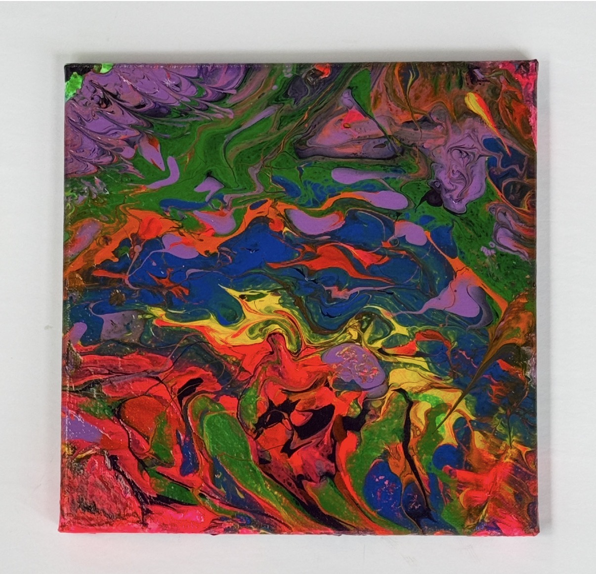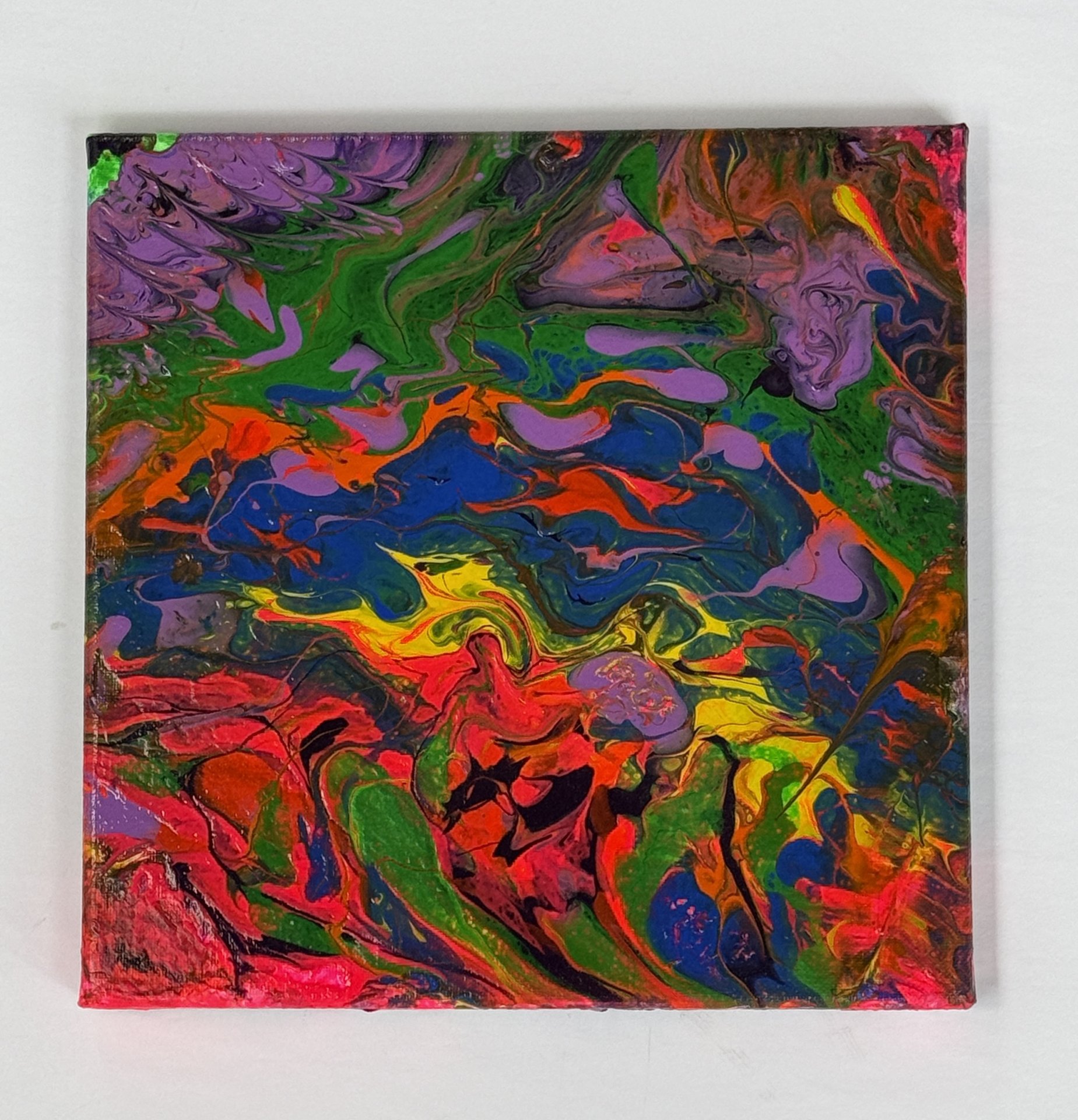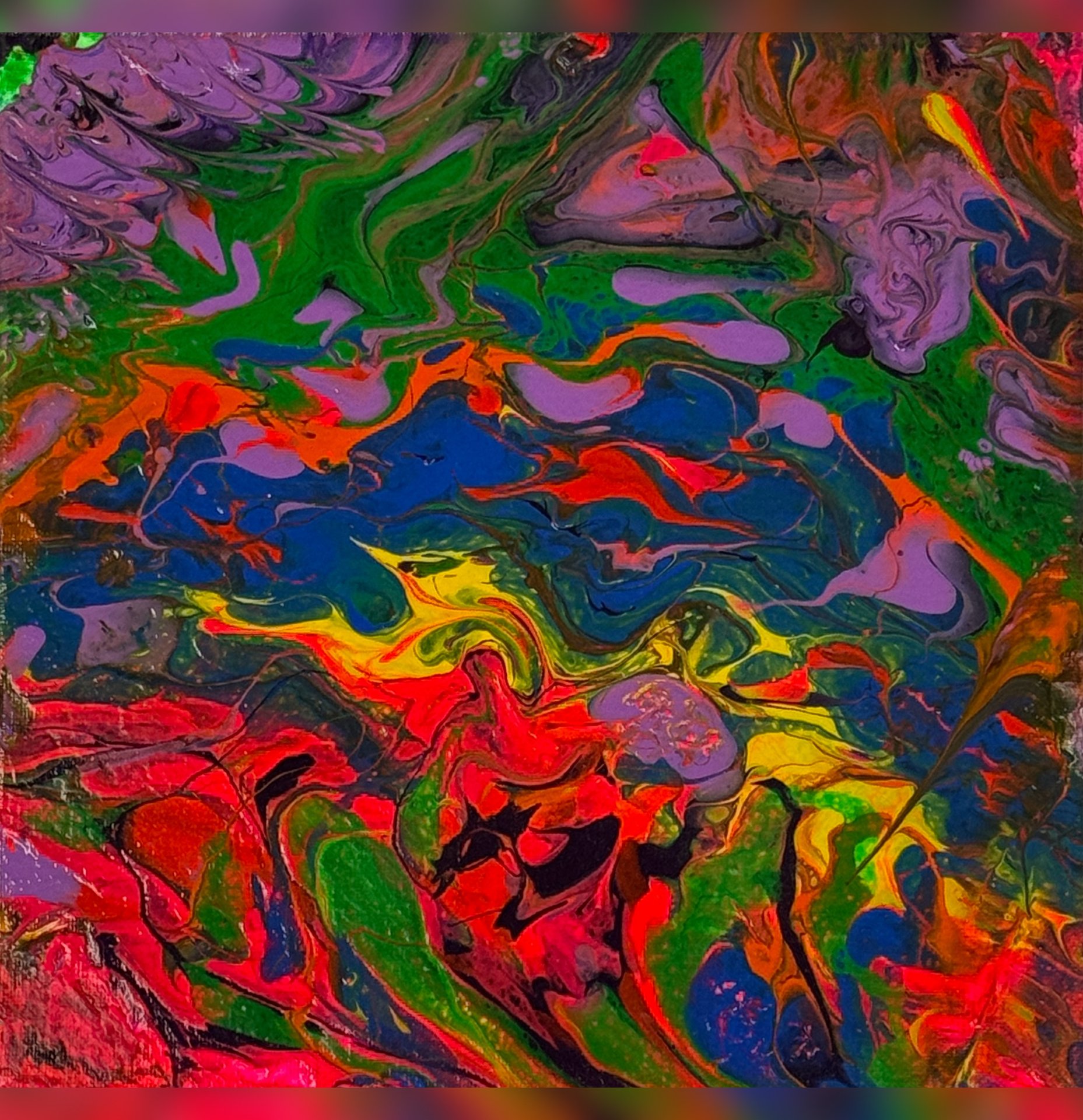 I named this abstract acrylic “THE BIG DISTRACTION” because this is where we’re at! A disgusting show of sword rattling by small men to distract from every other disgusting thing going on!!!!! Painted with acrylics on 8” square stretched canvas, signed and sealed with semi-gloss sealant.