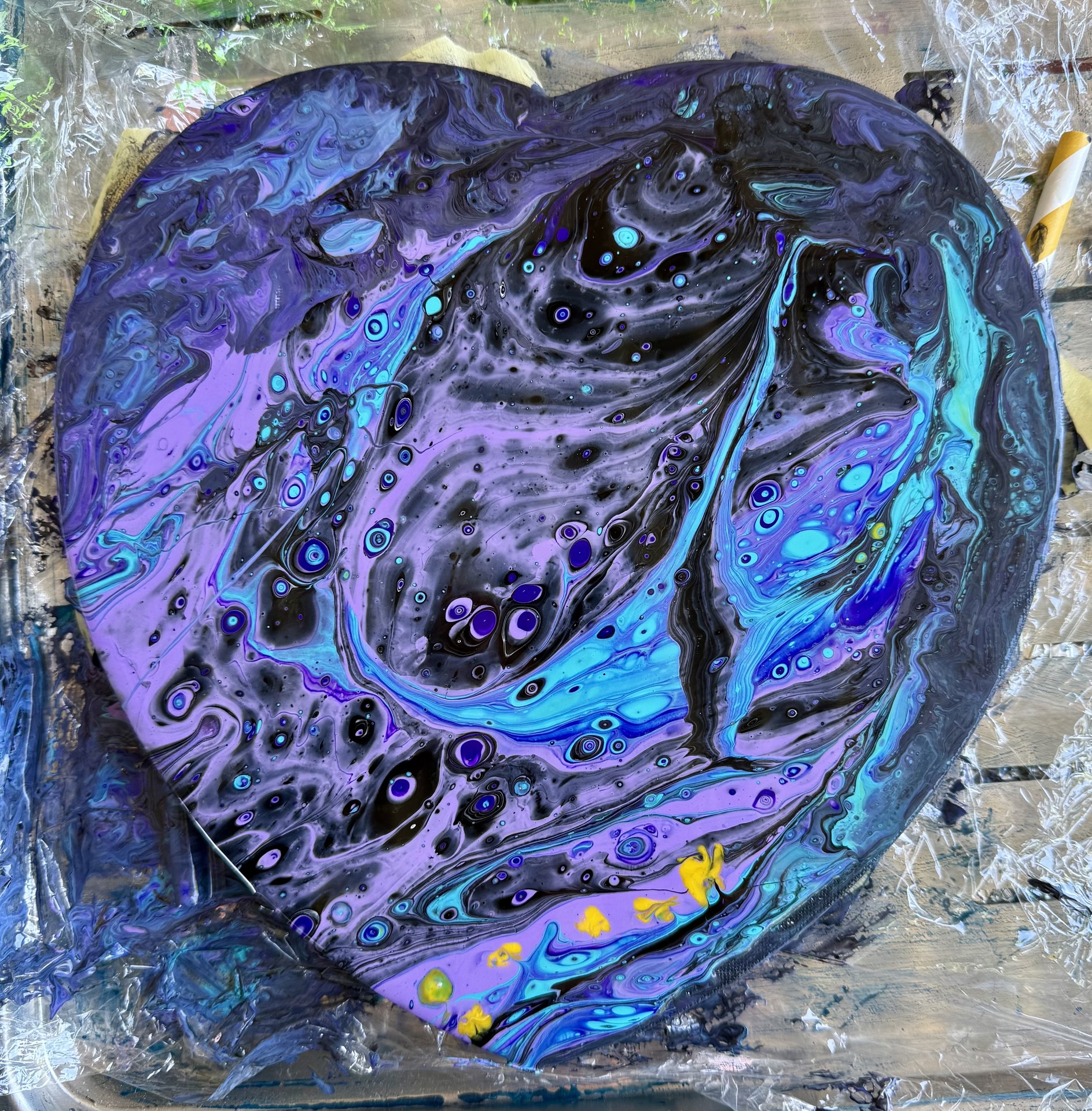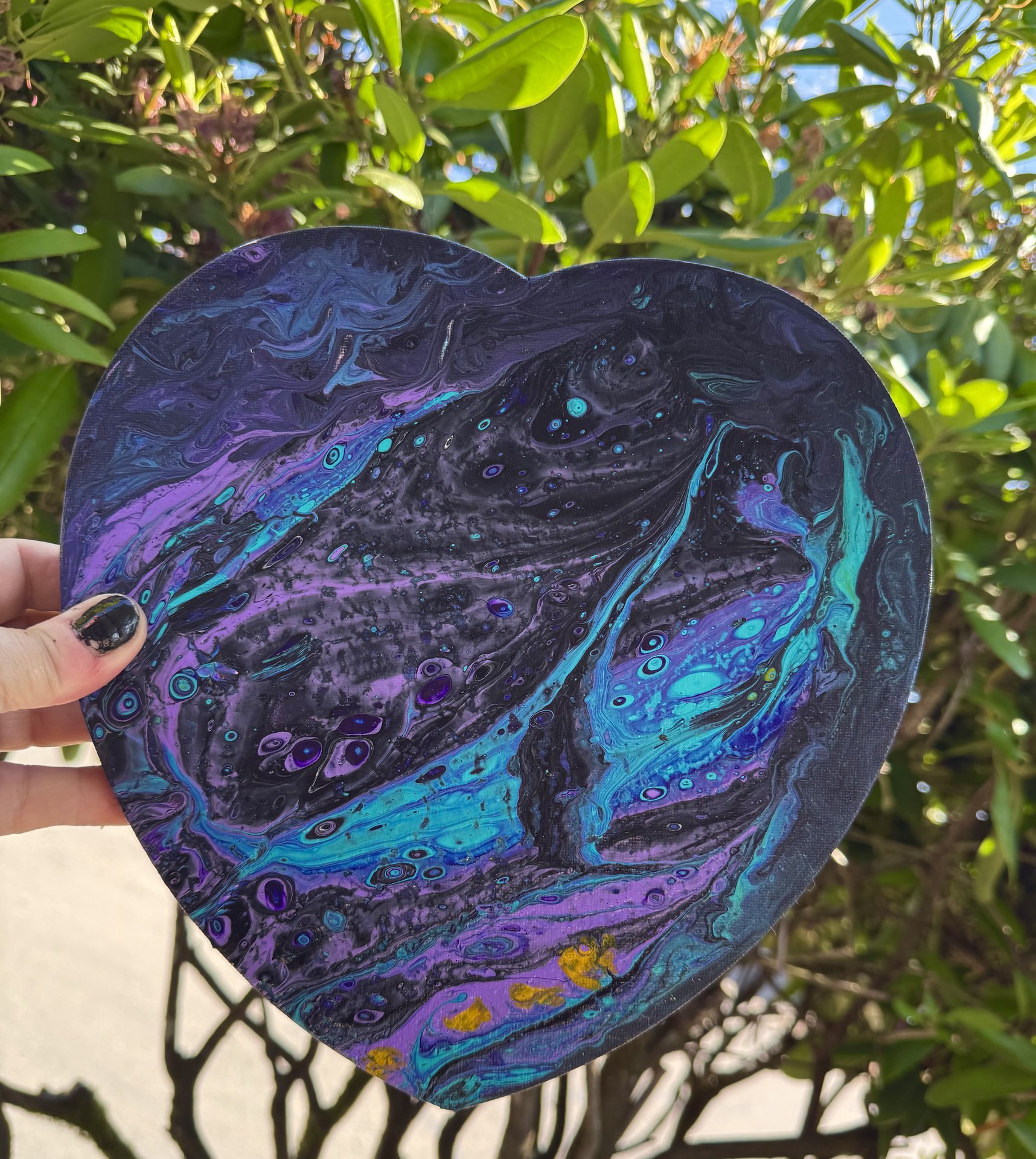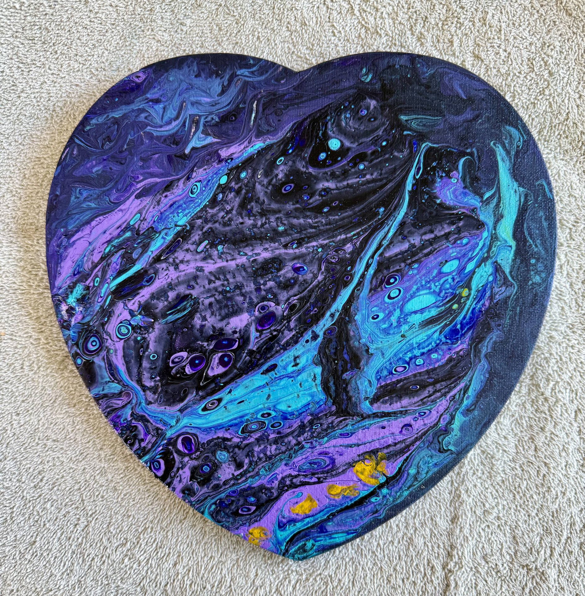 “DARK AS THE NIGHT” An acrylic fluid art painting on 10” x 10” x 3/4” heart shape stretched canvas on wood. Inspiredby the night sky the other evening. Painted on sides so no frame required and signed, dated and semi-gloss sealant for protection.