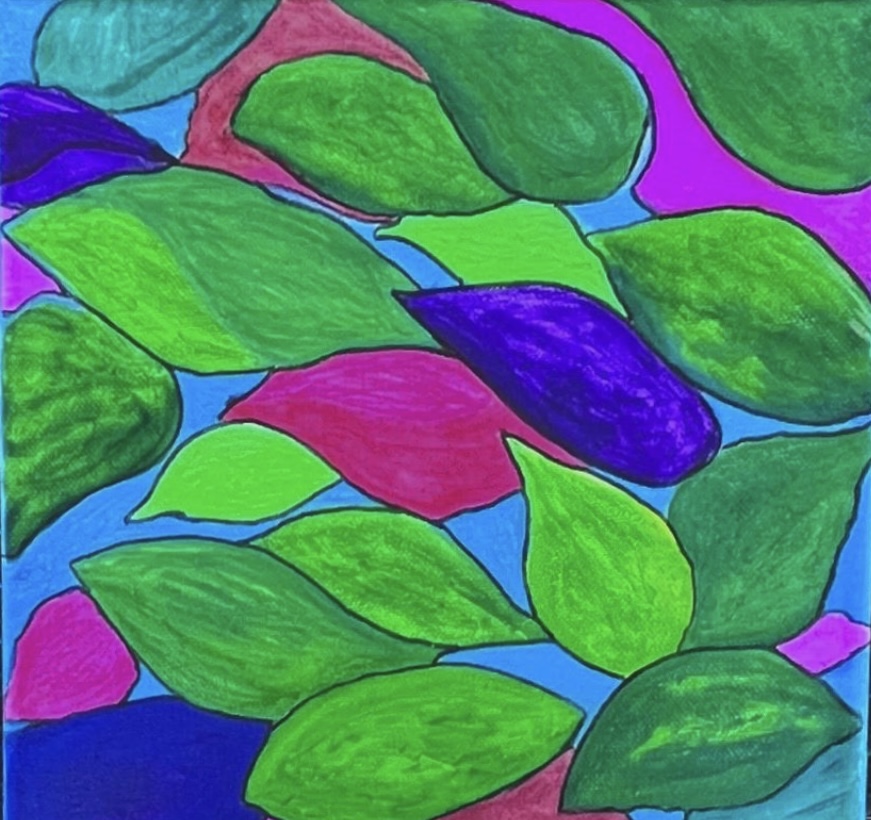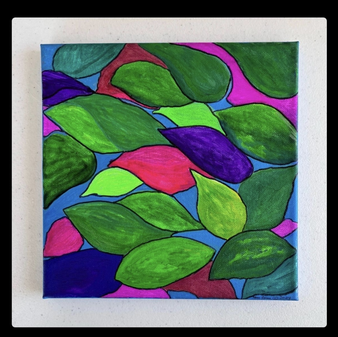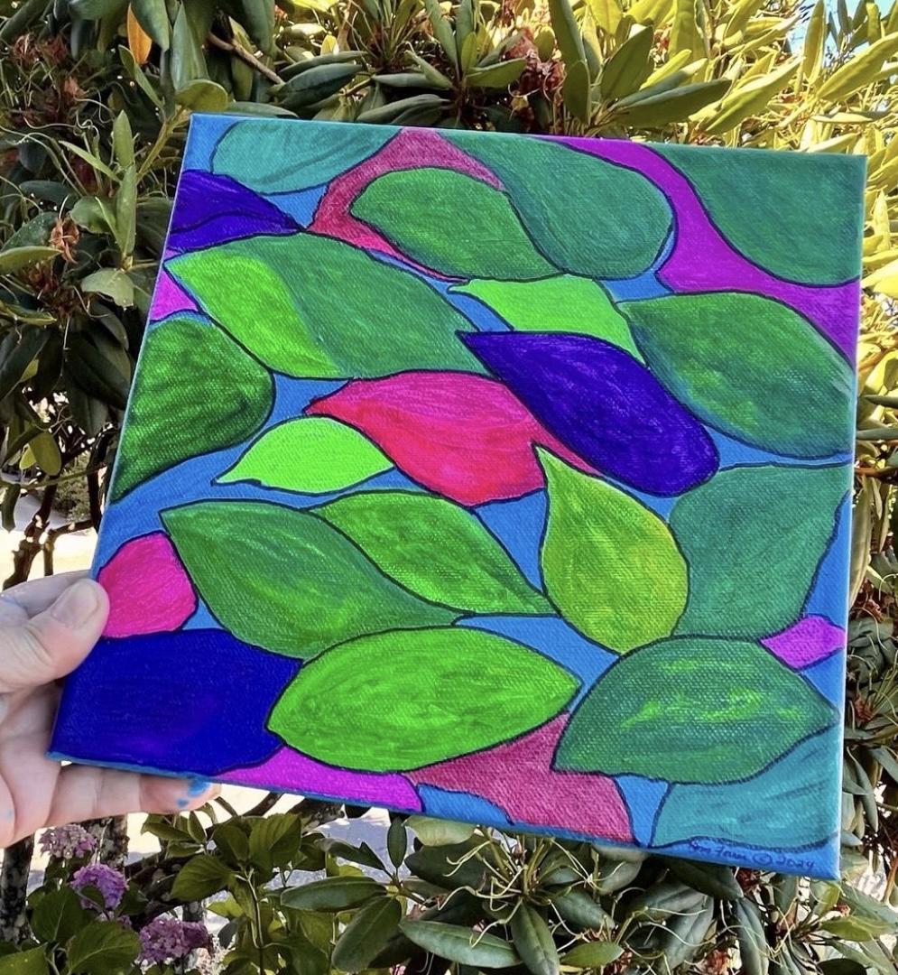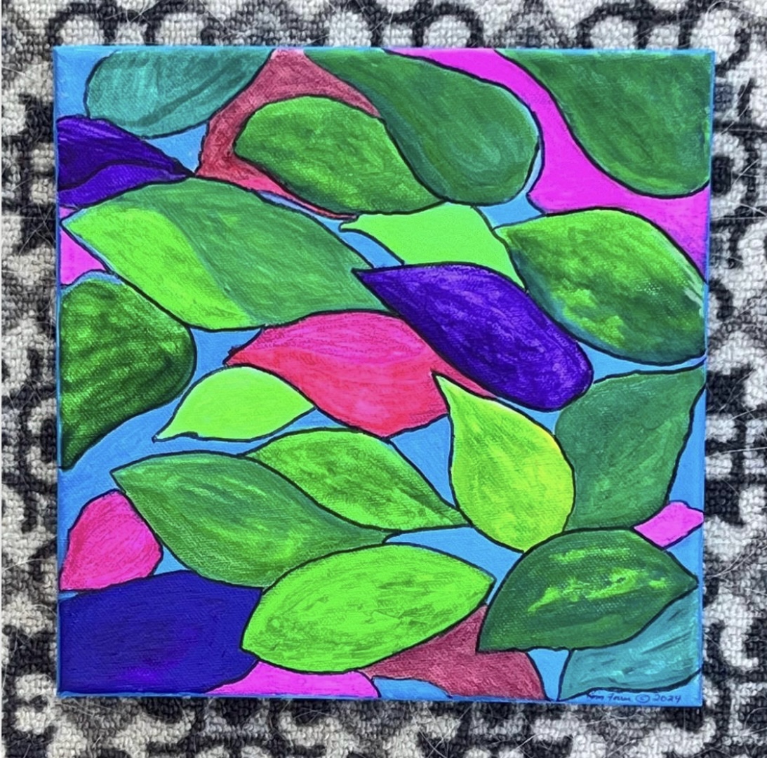 Magical colors of leaves falling into water. An original painting using acrylic paints and neon acrylics on canvas stretched on wood. Measuring 10" x 10" x 1/2". Canvas was painted on sides making it ready to hang (no frame required). Sealed with UV protection sealant. Painting is signed.