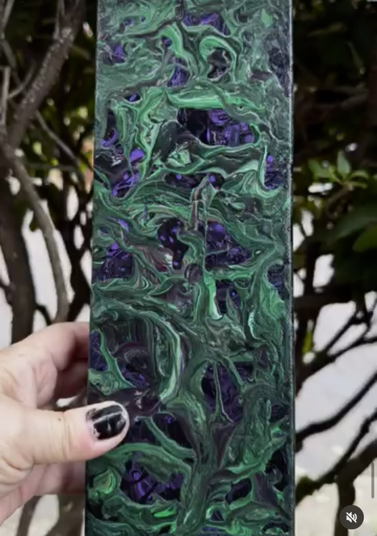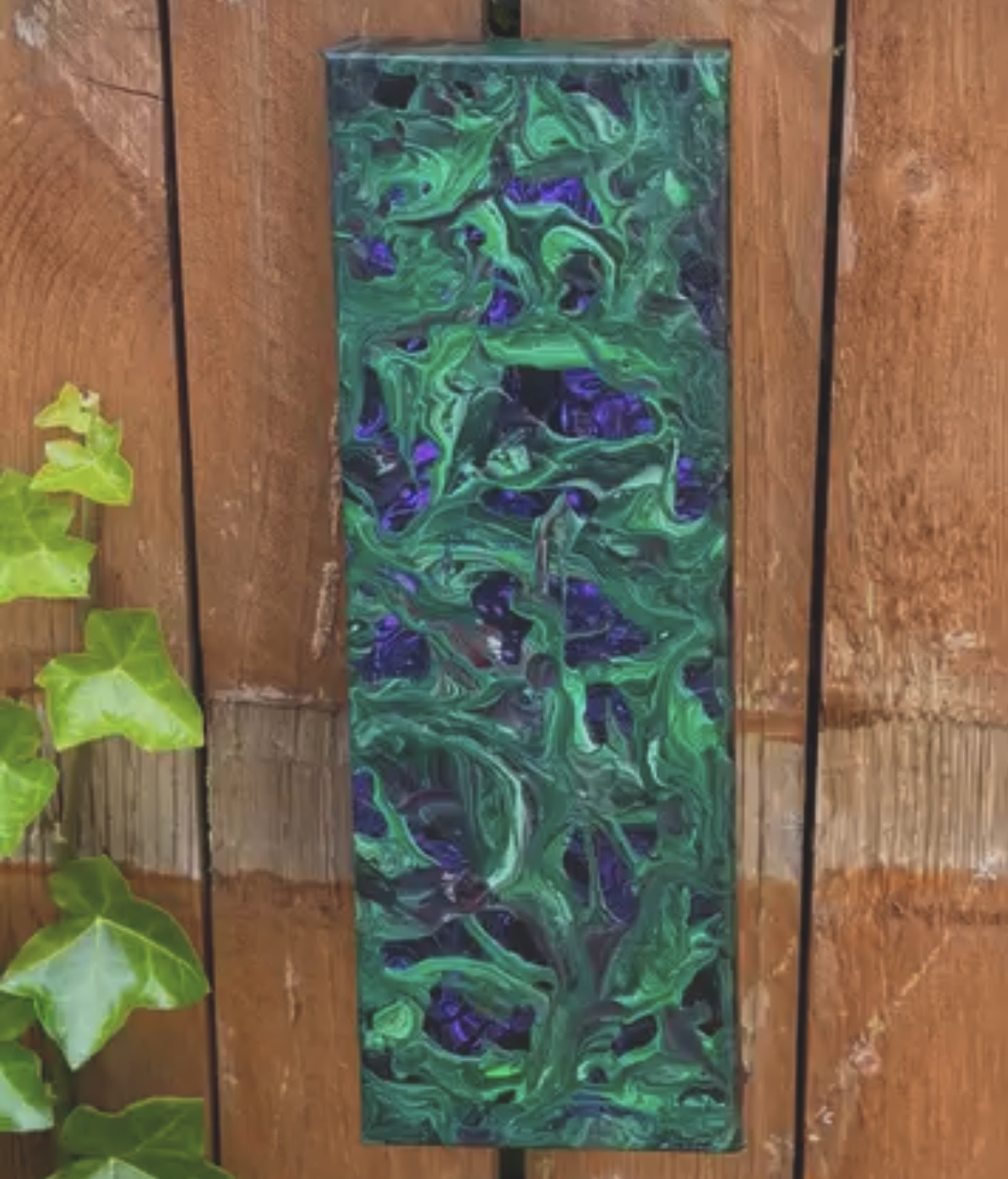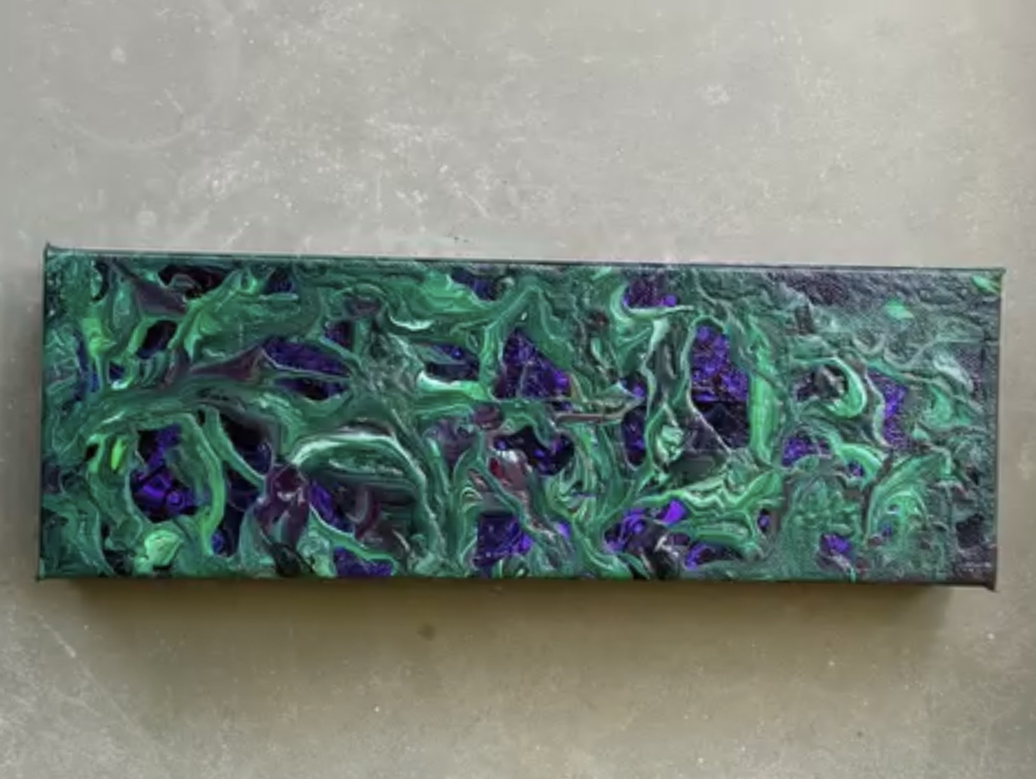 A big beautiful vine with purple flowers hidden in a tropical jungle. Gallery wrapped canvas measuring 12” x 4” x 1-1/2”. Sealed, signed and painted on sides so ready to hang in that small space that needs a pop of purple & green.