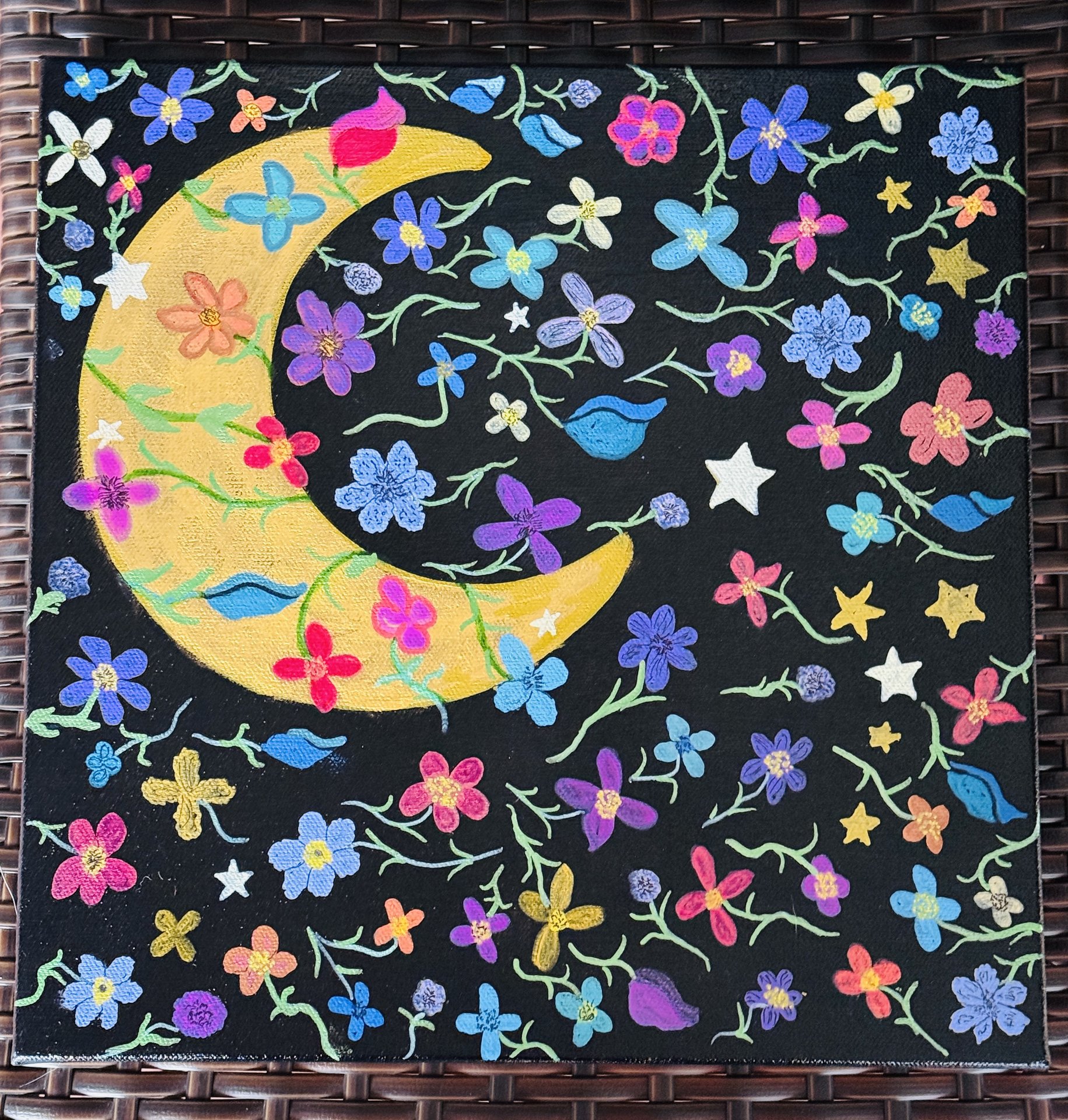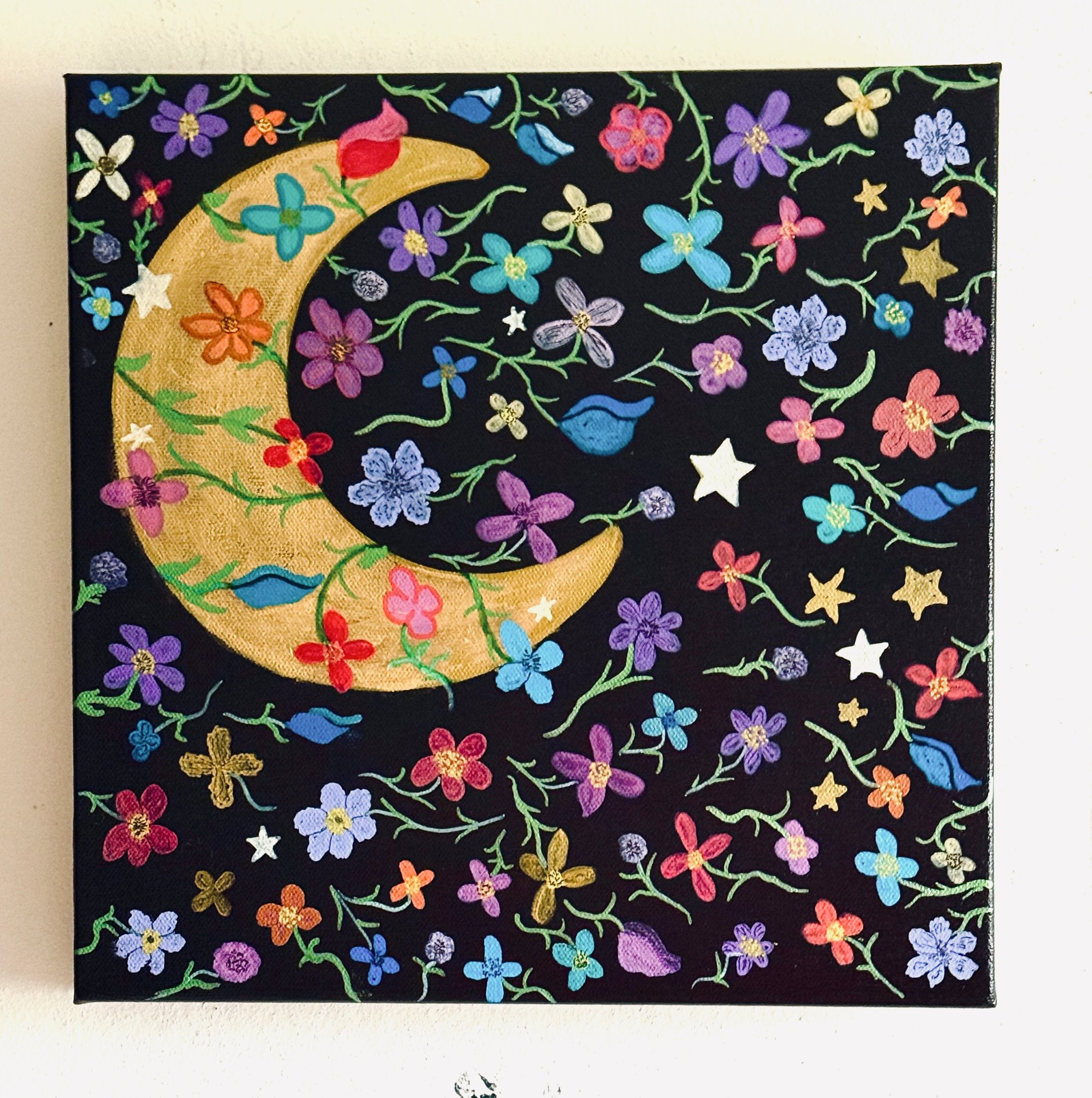 Magical and colorful wildflowers floating and vining around the moon from a mythical garden. Definitely a garden I’d like to be in! Acrylics on a 12” square x 1-1/2”. Painted on the sides and ready to hang! Painting is signed and sealed for protection.