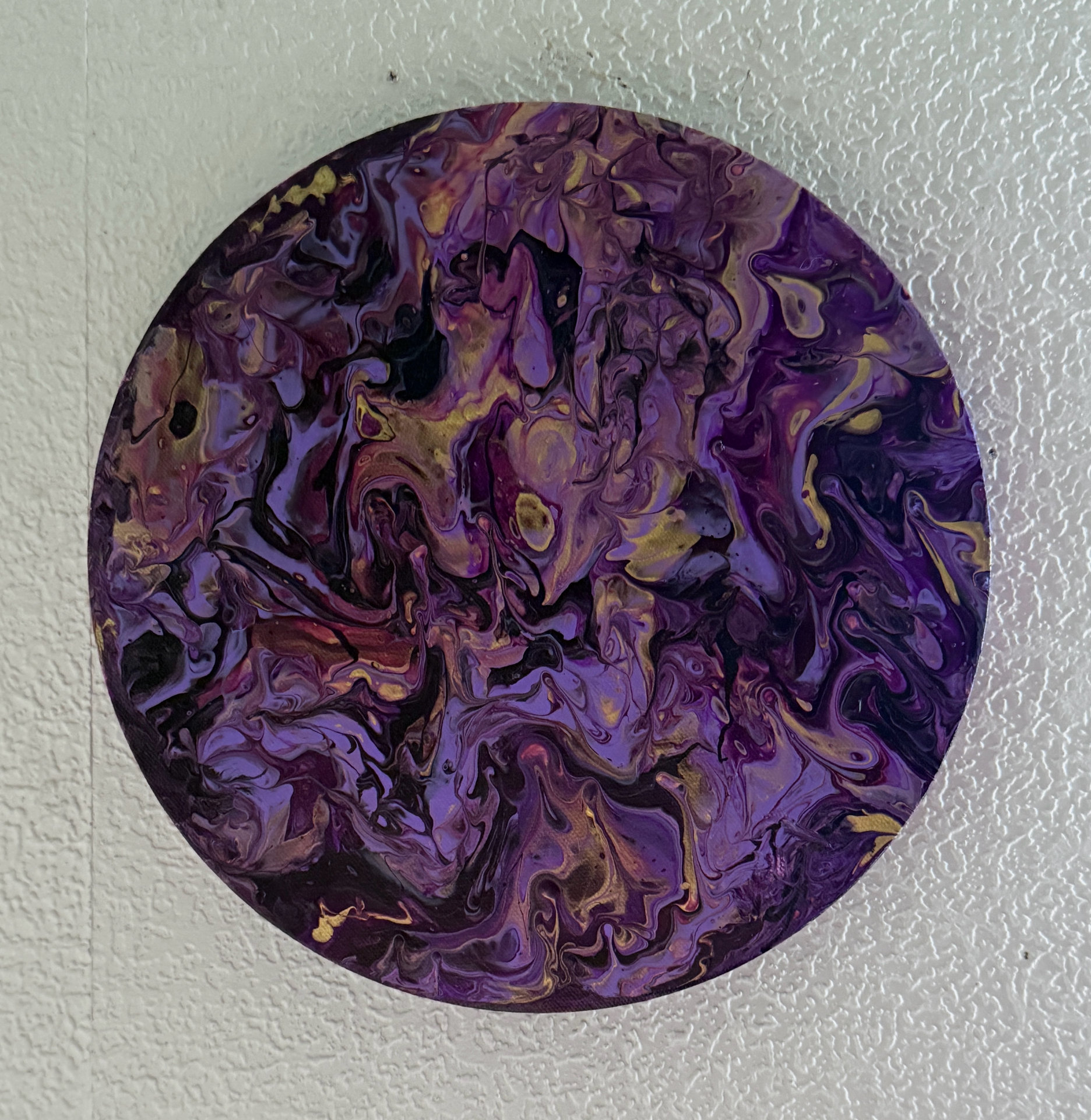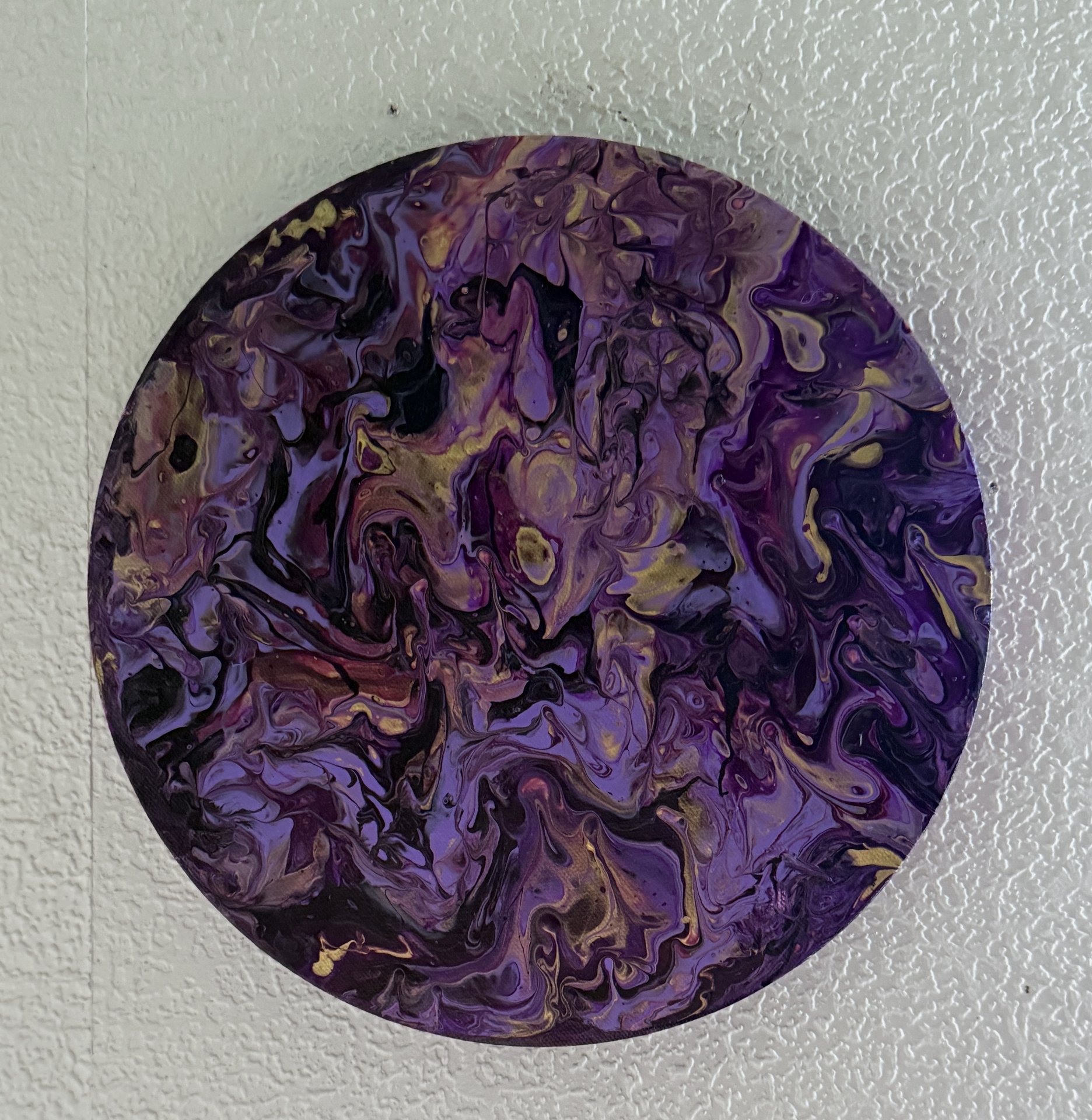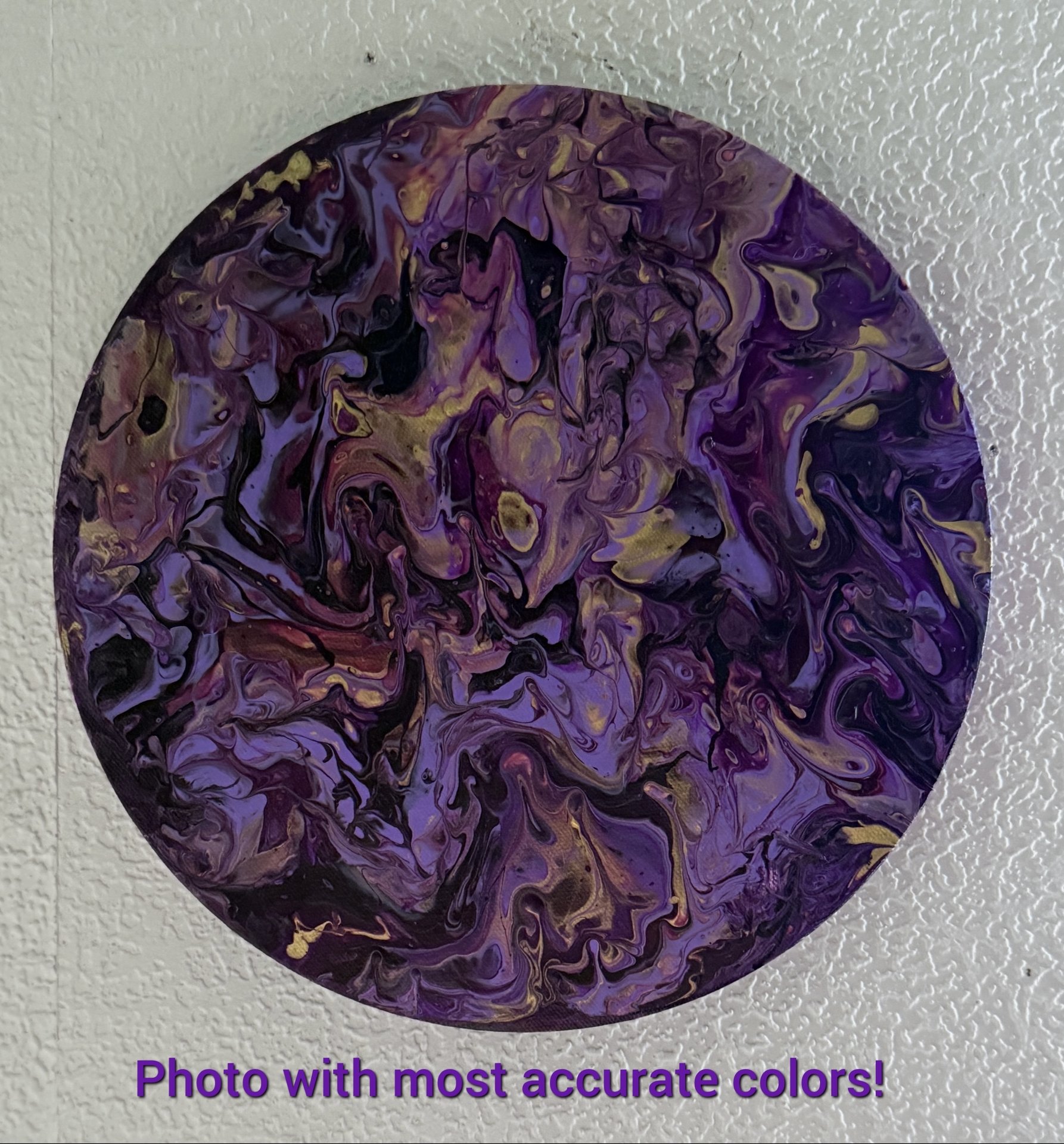 Acrylic abstract art on 10” round gallery wrapped canvas. I had a difficult getting the photos to reflect the real colors used (dark purple, light purple, gold and small amount of black). 1st photo is the truest colors. Painting has been sealed, signed and ready to hang.