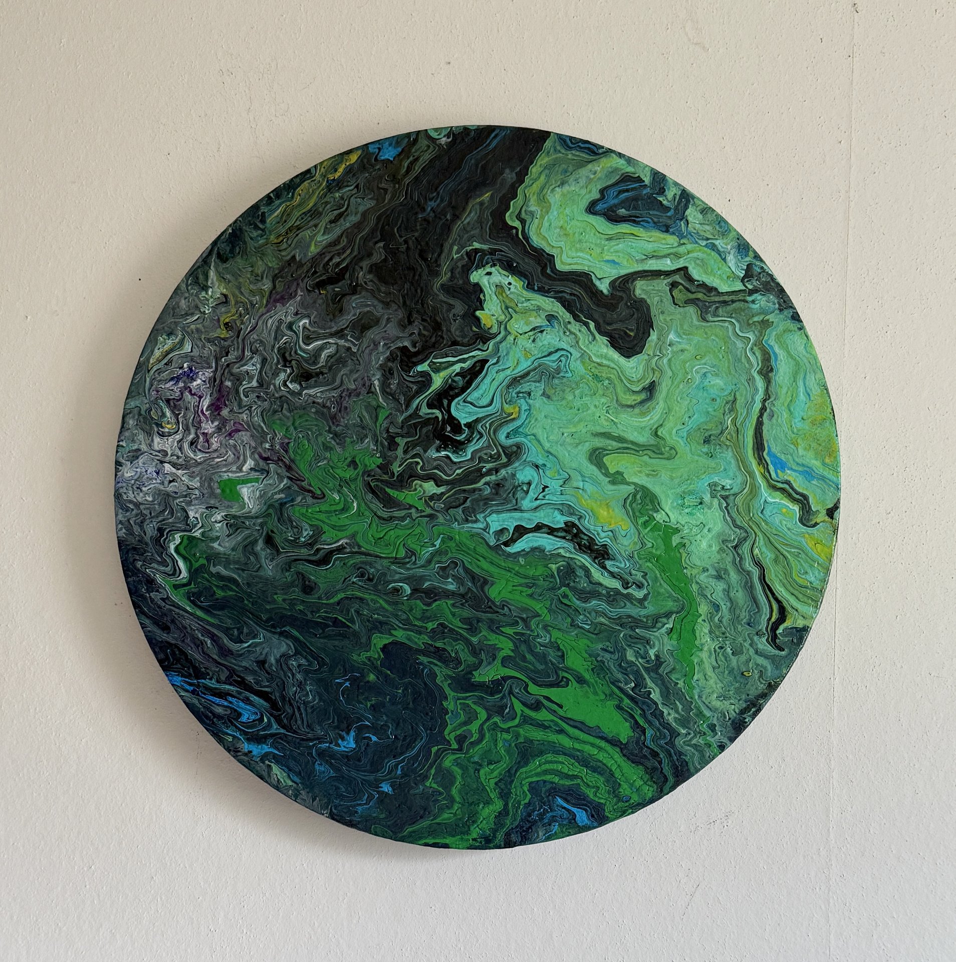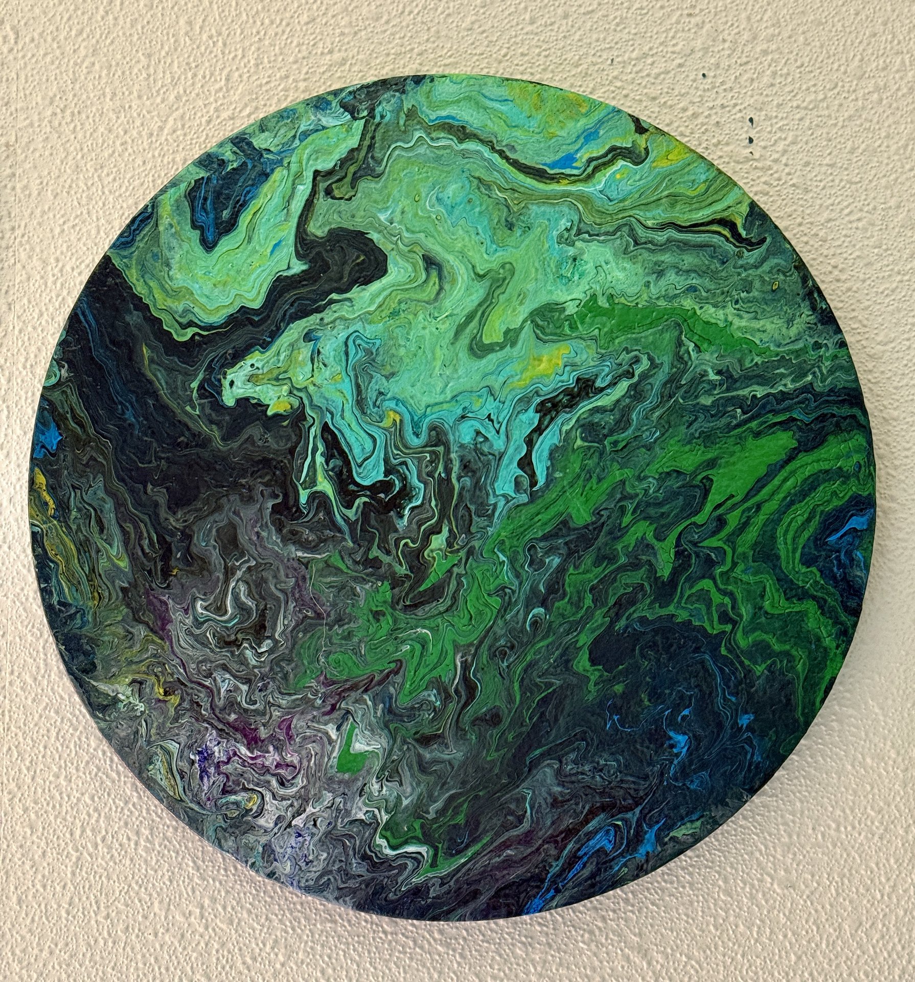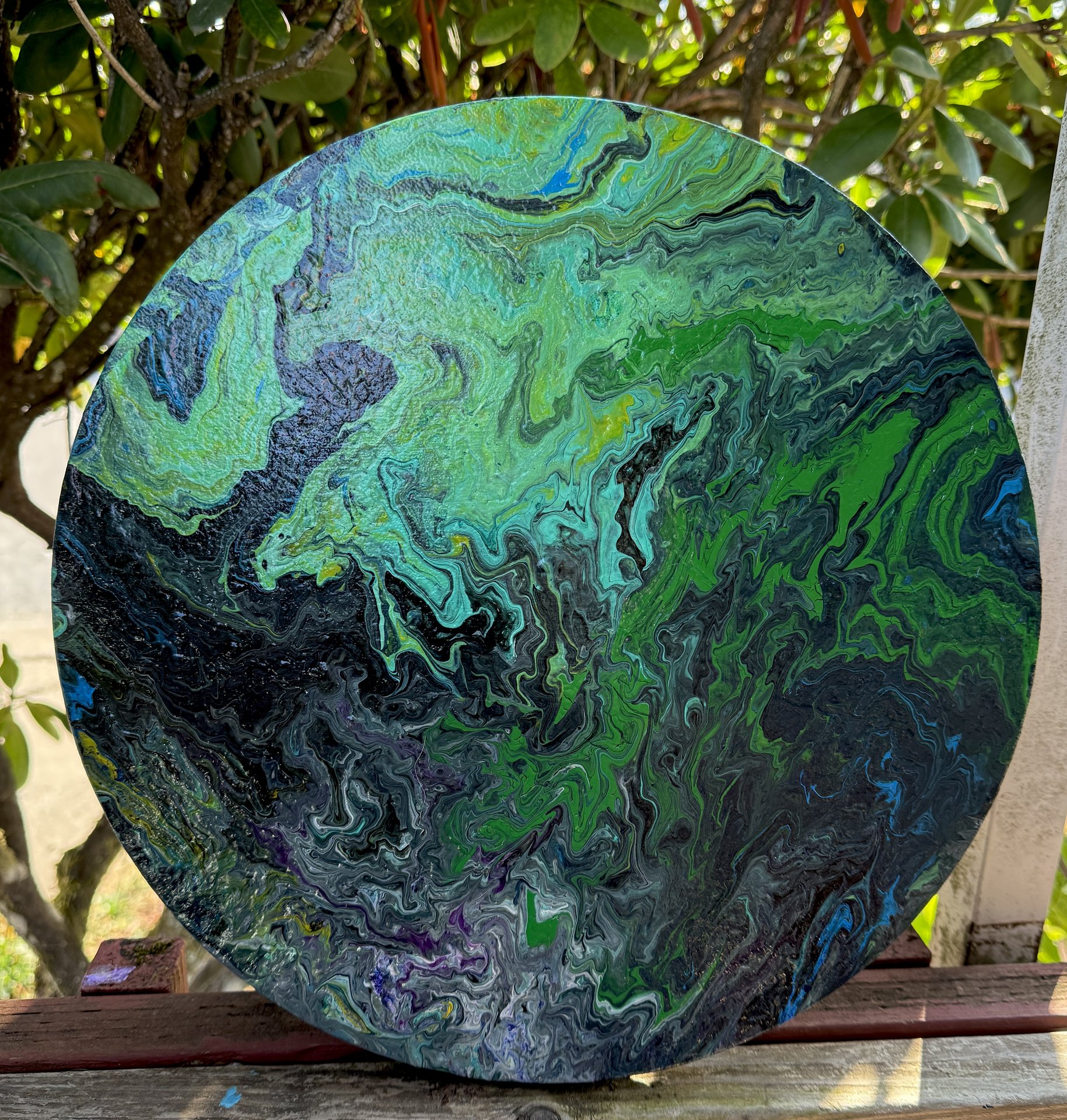 An acrylic fluid pour on 14” round stretched canvas. This actually turned out the way I envisioned. Painted on sides so she’s ready to hang. I think this kinda sums up the way things currently are!
